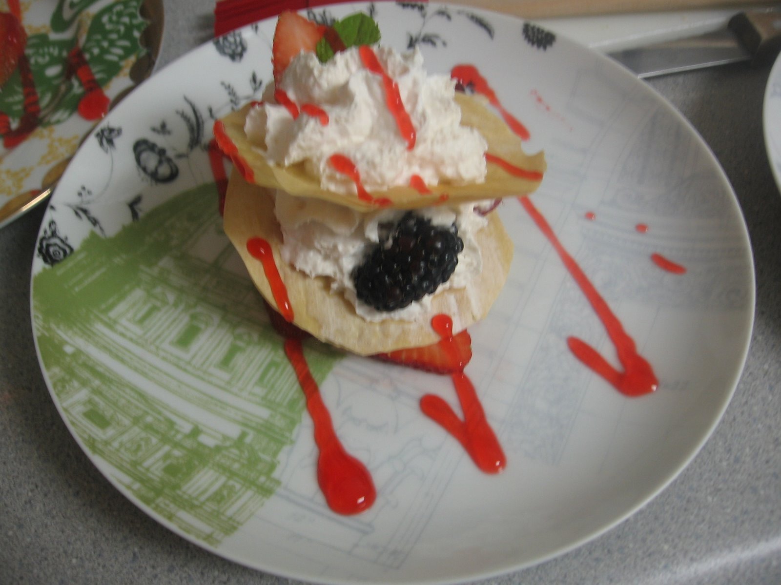 This is one of my inventions and still needs improvement, but it was fun and easy to make. The literal translation for this dish is “berries on air” because the crisps and whipped cream are so light it is almost as if the berries are suspended in air. The crisps and cream are also very airy in taste and texture so that when you take a bite-full of the dessert, the cream and crisp quickly dissolve and the berries are left to be savored. This dessert really showcases the berries and the berries just need the cream and crisps to stand a little higher and fanciful.