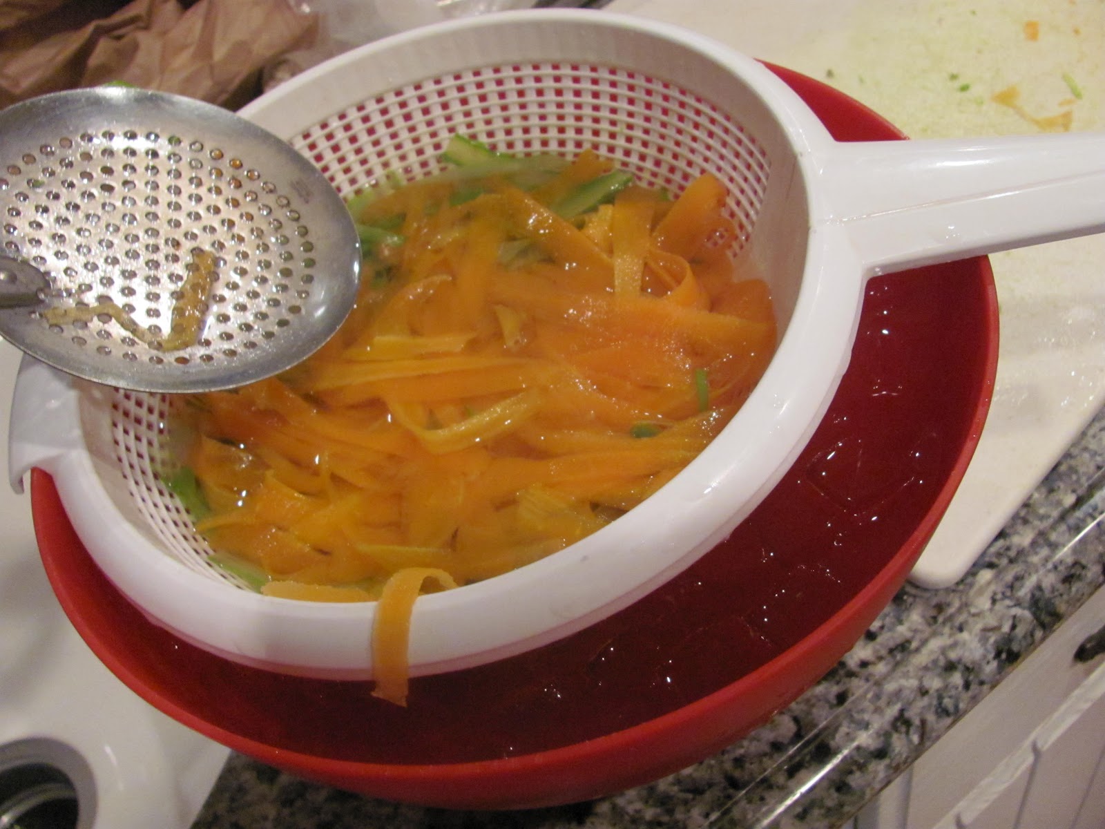2. Peel the tough ends of the asparagus and trim the stems. Using a mandolin or vegetable peel, peel ribbons and set aside. Do the same for the carrots. Slice the onion thinly and place in cold water (to tone down onion-y flavor).