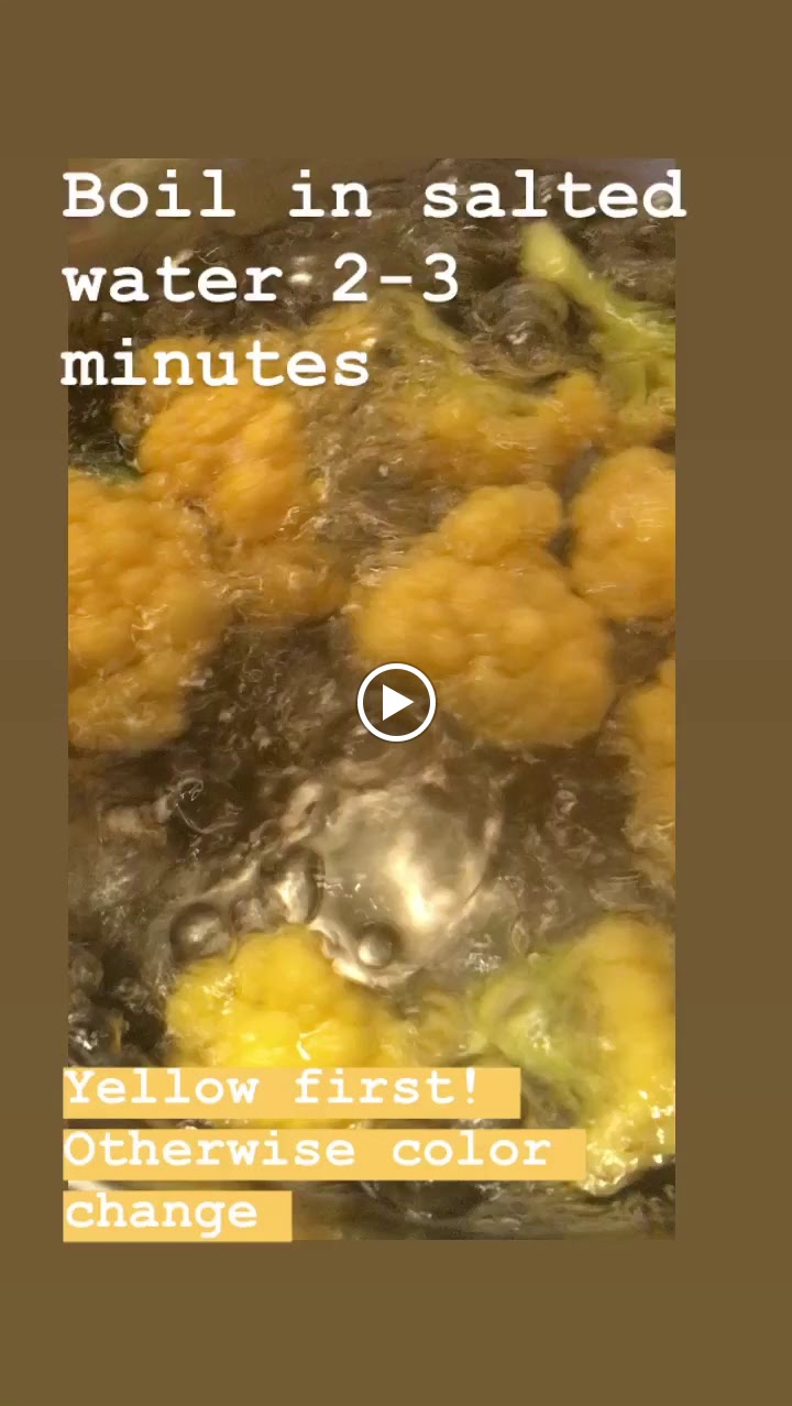 2. First, place yellow cauliflower and cook 2-3 minutes or fork tender. Then, remove and set aside. Repeat with the purple ones. Do it in this order because the purples ones change the color (It’s cool!) and it would make the yellow ones not look so great.