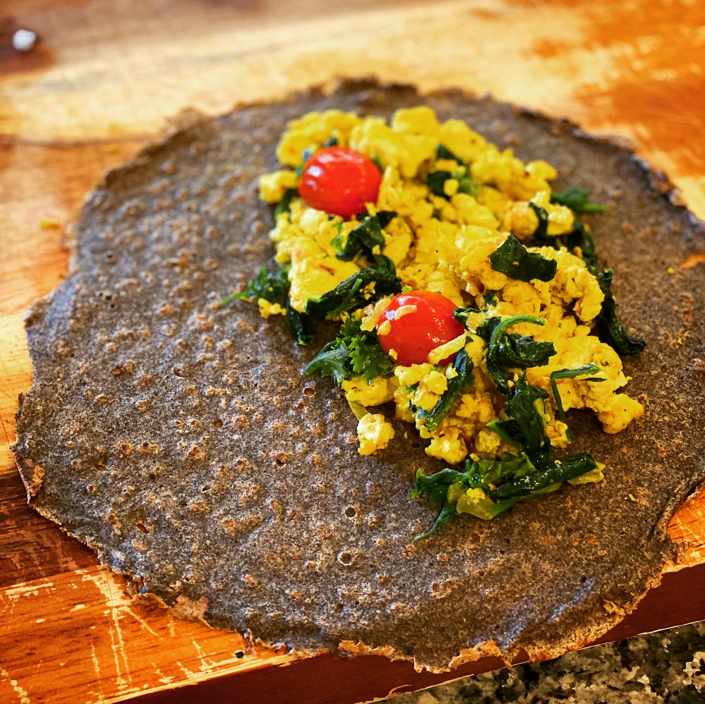 - Heat buckwheat crepe on a hot plate for a few seconds if from the fridge. Then spoon ⅓ of tofu-egg mixture in crepe and fold over. Serve with salad if desired. I like a little hot sauce on mine. Avocado would be nice too. Enjoy!